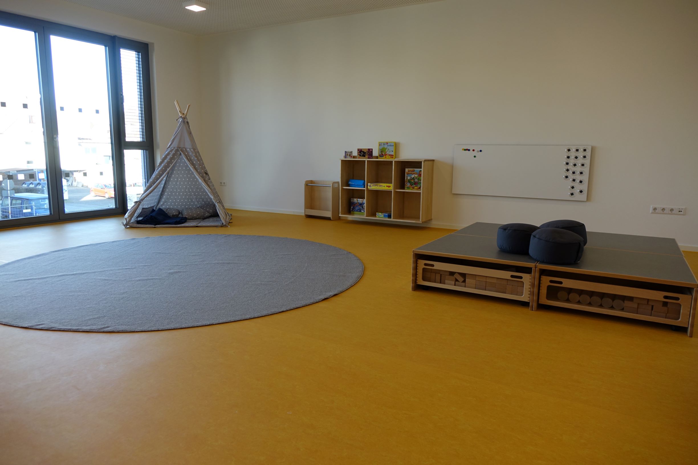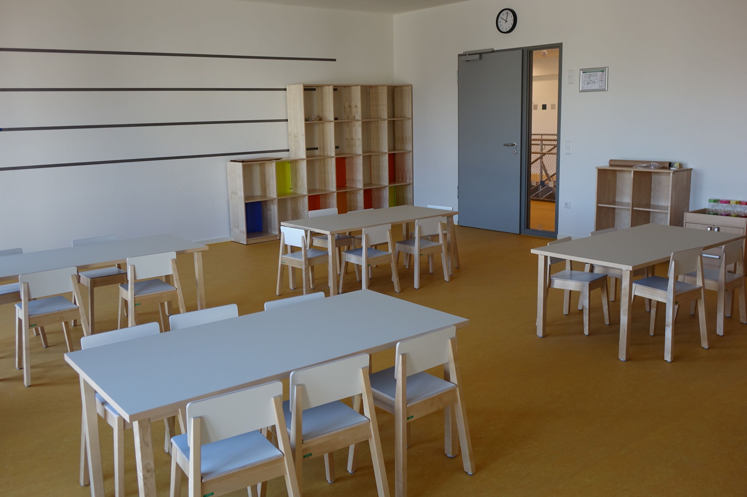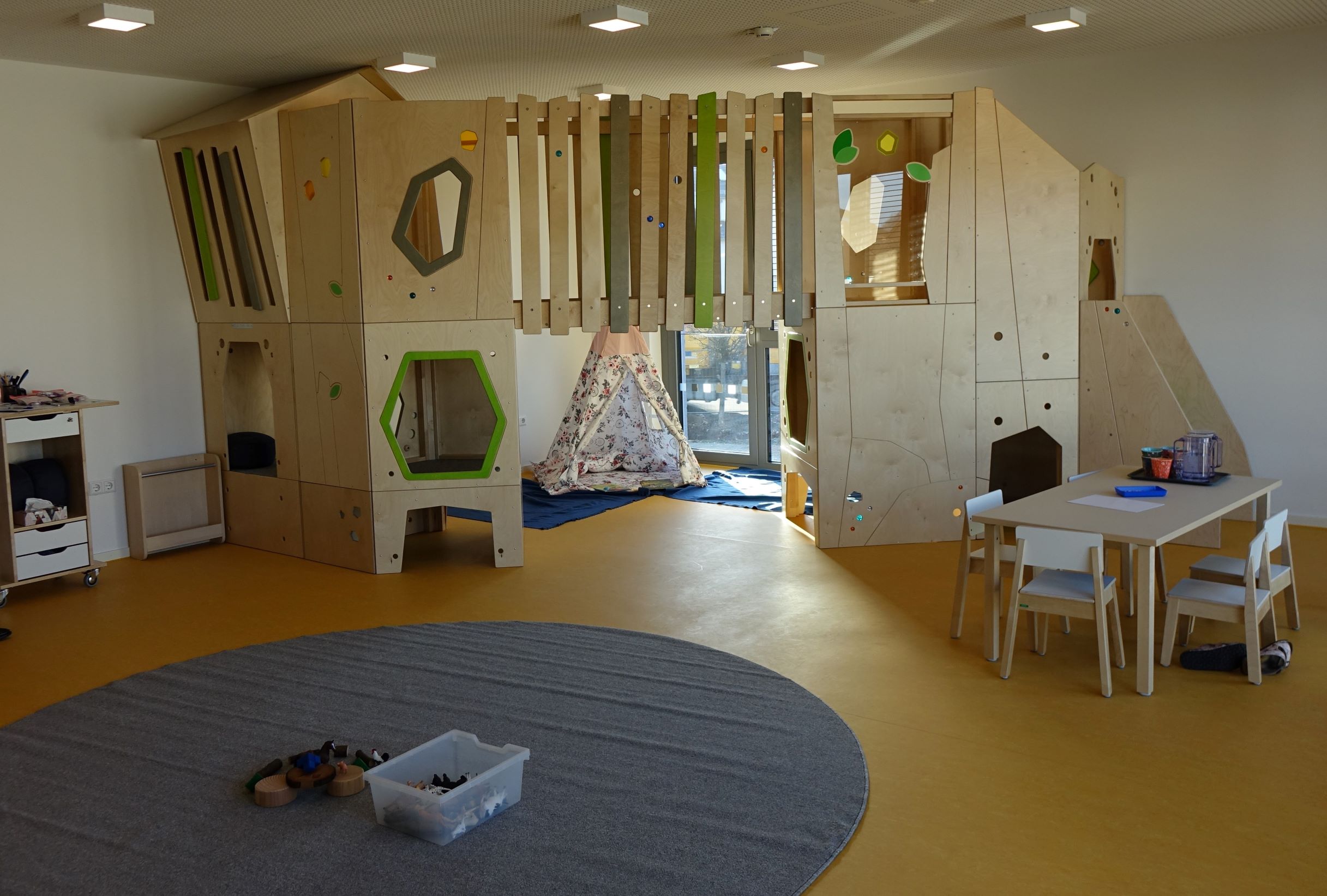 Zwischen 7:00 und 8:00 Uhr treffen sich alle Kinder des Hauses zur Frühgruppe in der Mehrzweckhalle. Ab 8:00 Uhr wechseln die Kinder in ihre jeweiligen Gruppenräume